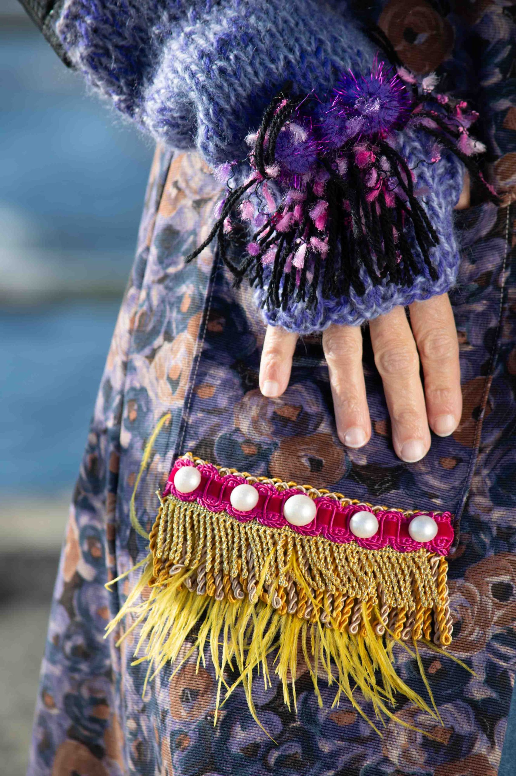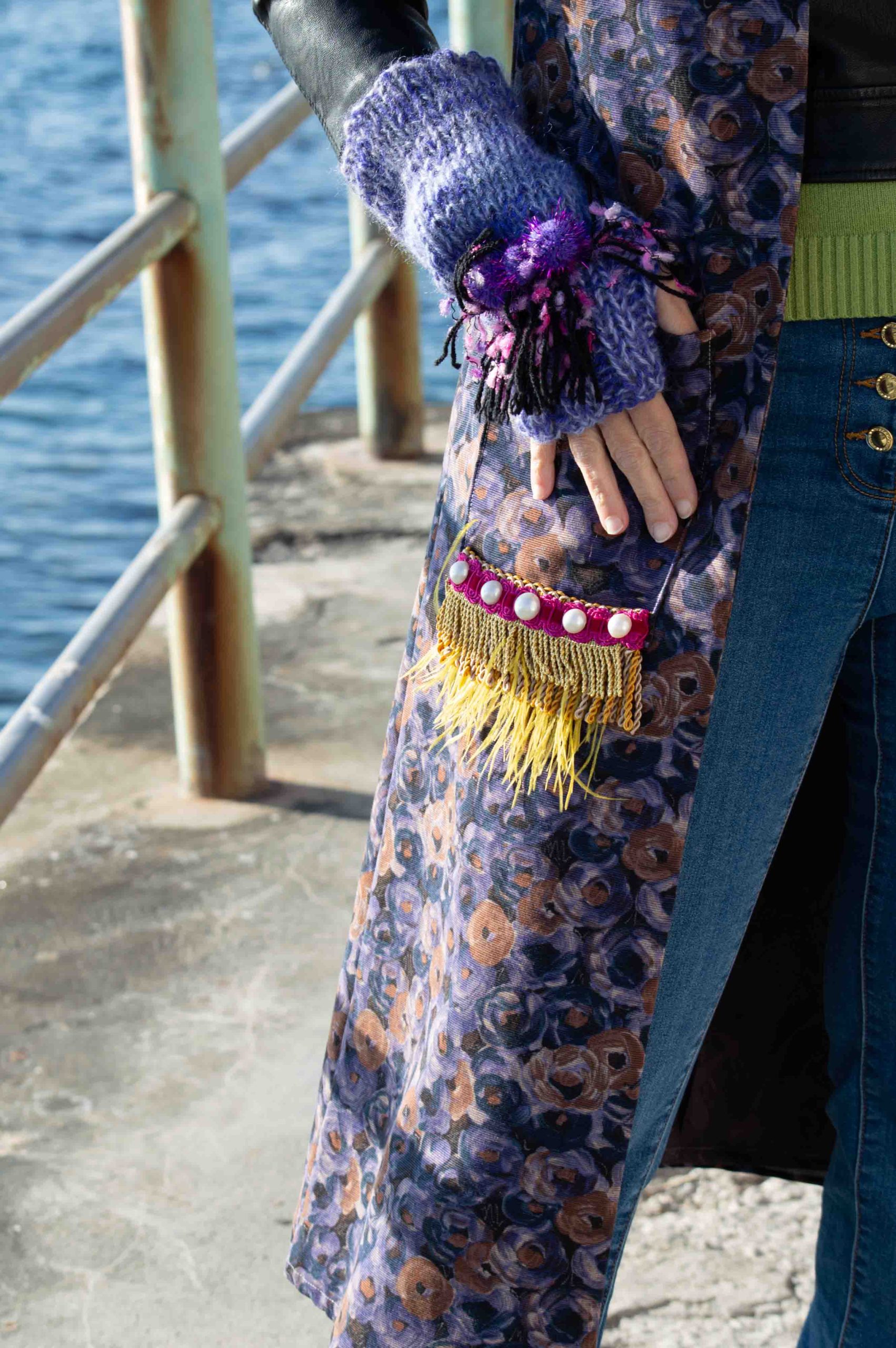 Grandi tasche impreziosite con passamanerie, perle sintetiche, frange e piume.