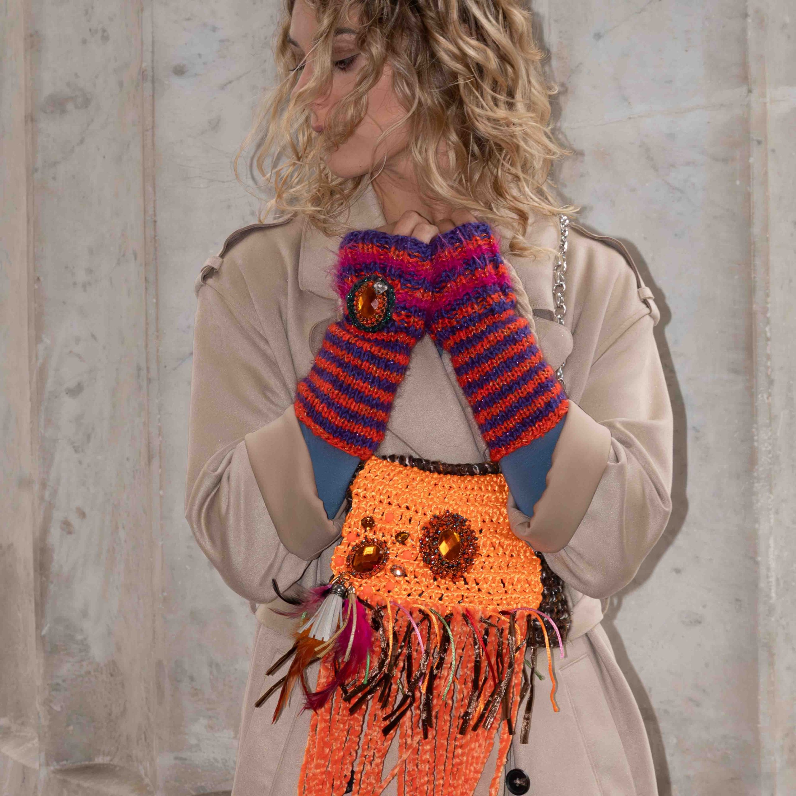 Mezzi guanti in lana merinos, misto lana e lurex lavorati a tricot e realizzati a righe arancione e viola decorati con dettaglio tondo lavorato a crochet e grande strass gioiello centrale.