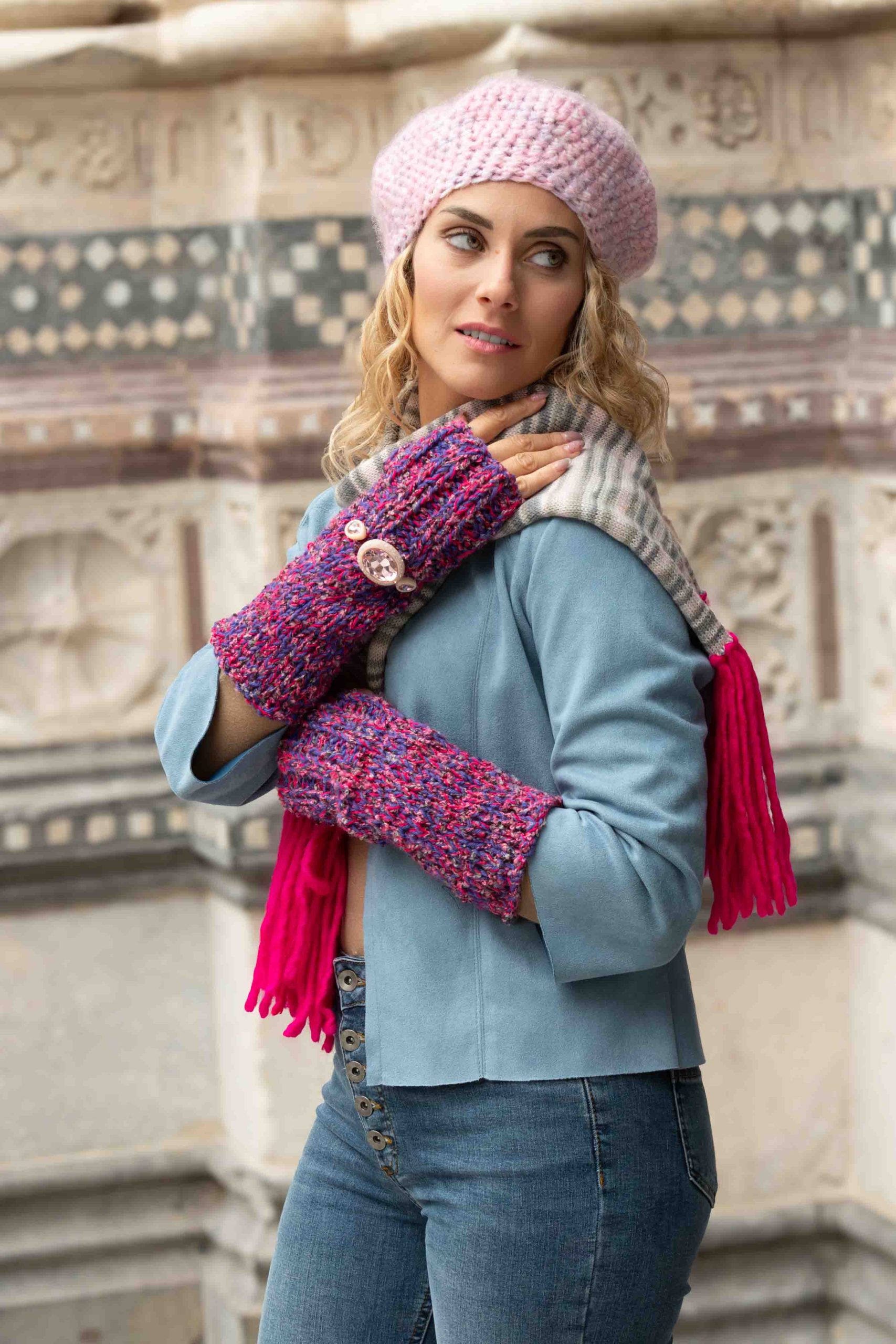 Mezzi guanti in lana e bouclè viola e fuxia