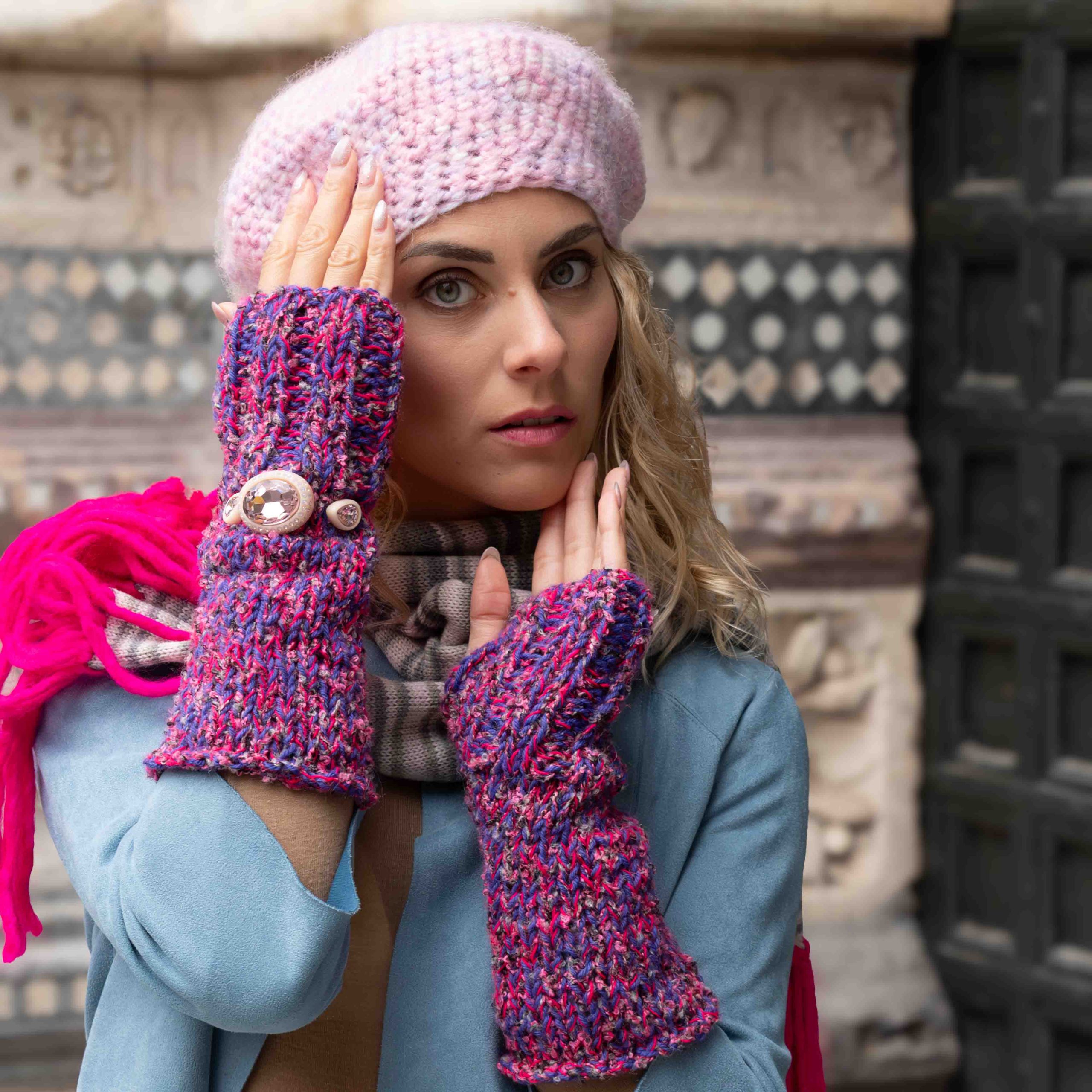 Mezzi guanti midi lavorati a tricot in misto lana, lana merinos e lana bouclè in fuxia e viola decorato con grandi strass rosa.